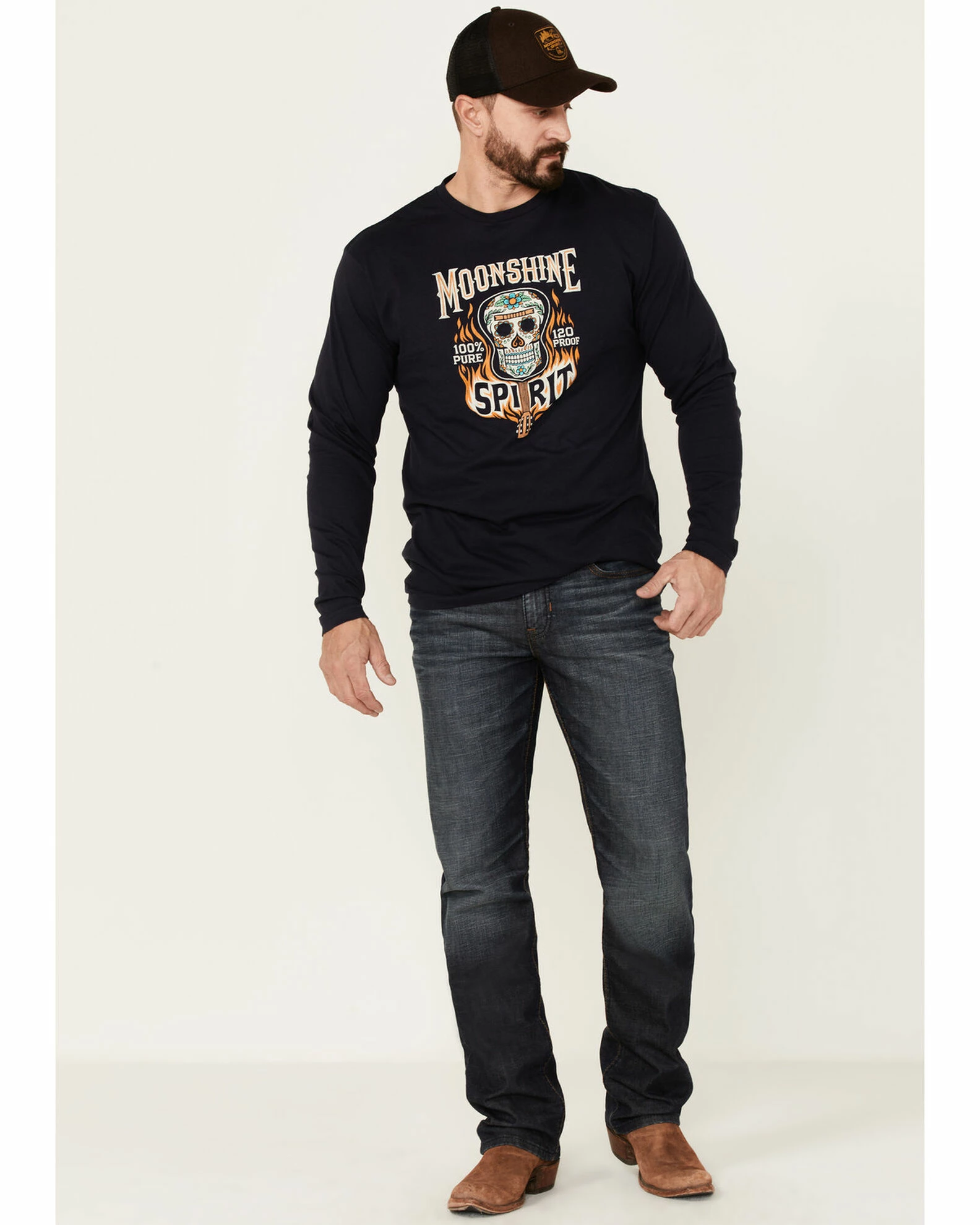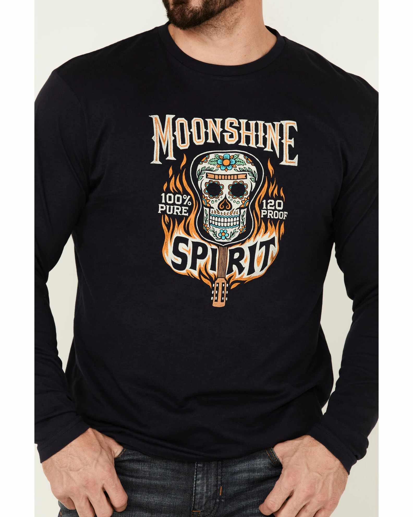 - “Moonshine Spirit 120 Proof Premium Quality” with fire guitar & fiesta skull graphic on front