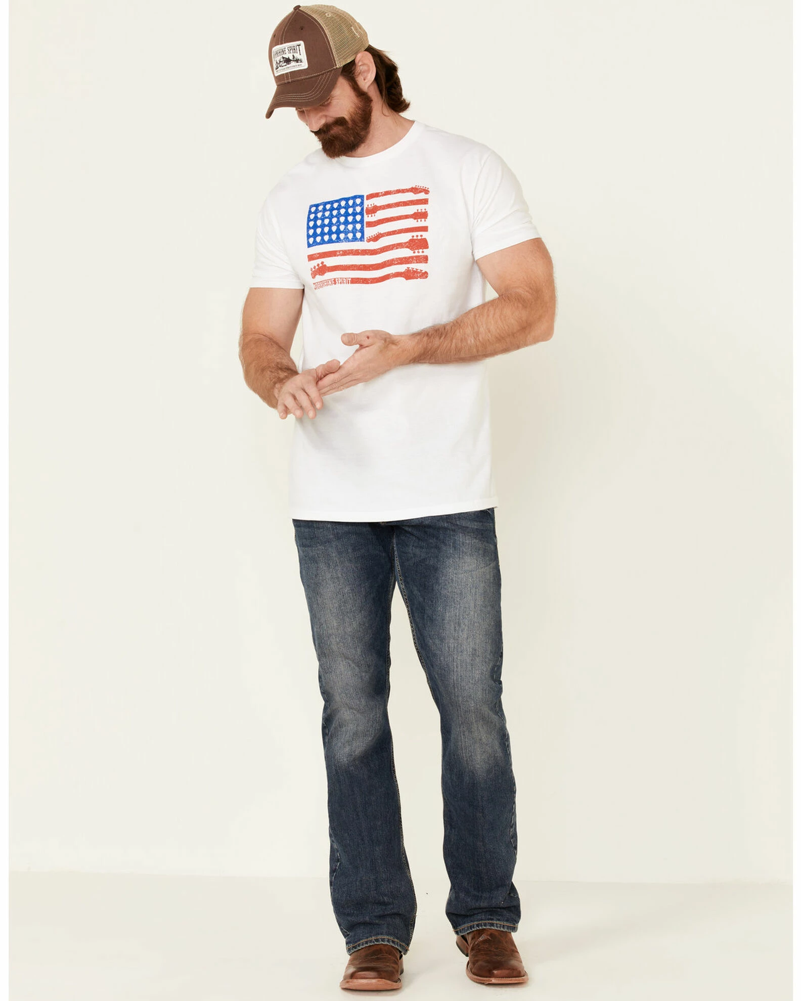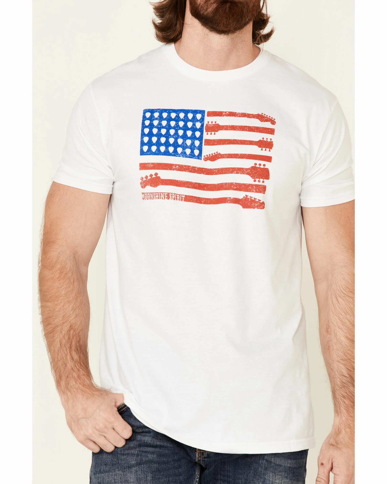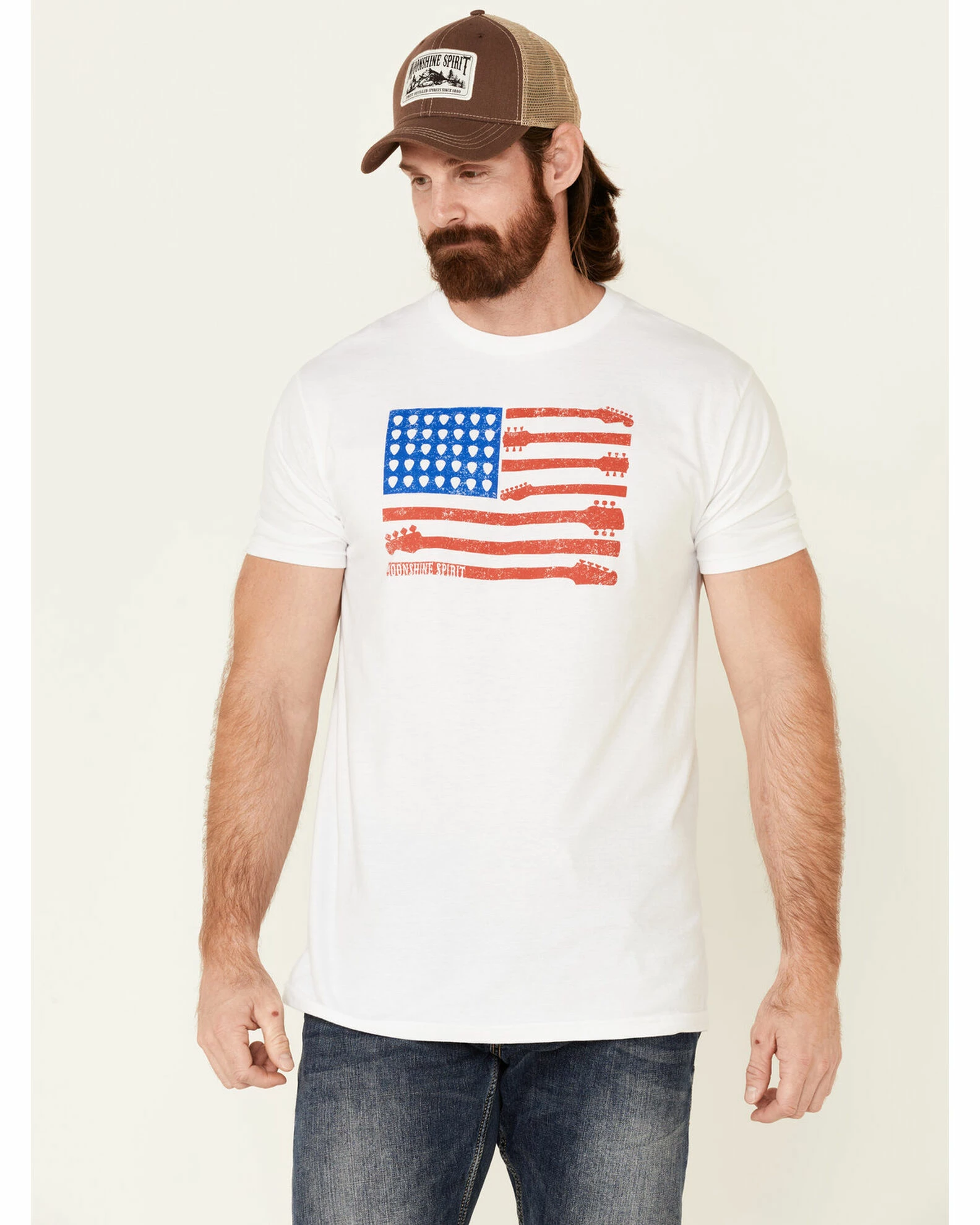 - “Moonshine Spirit” with hearts & guitars American flag graphic on front