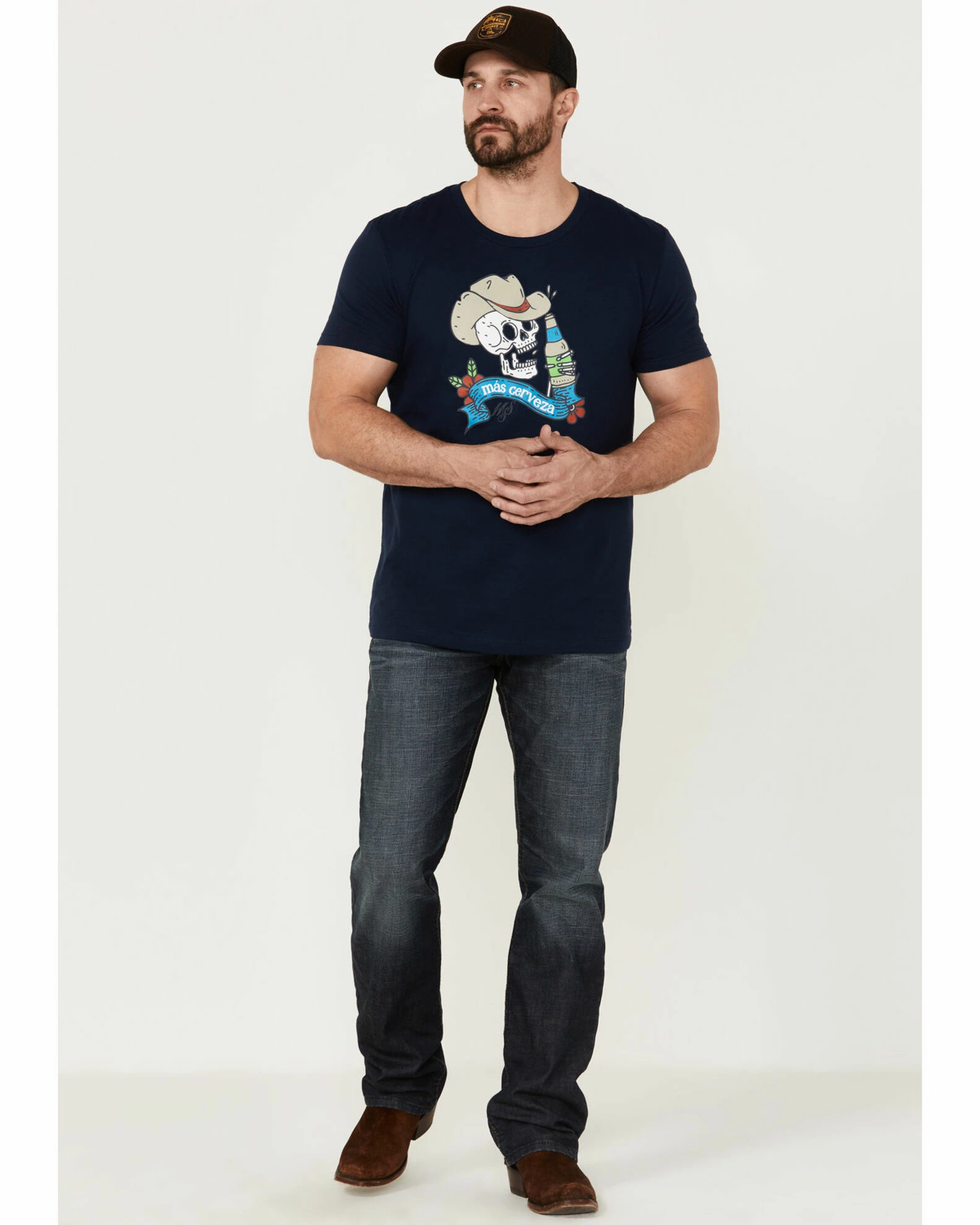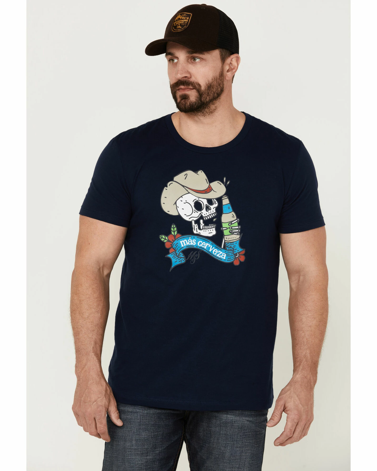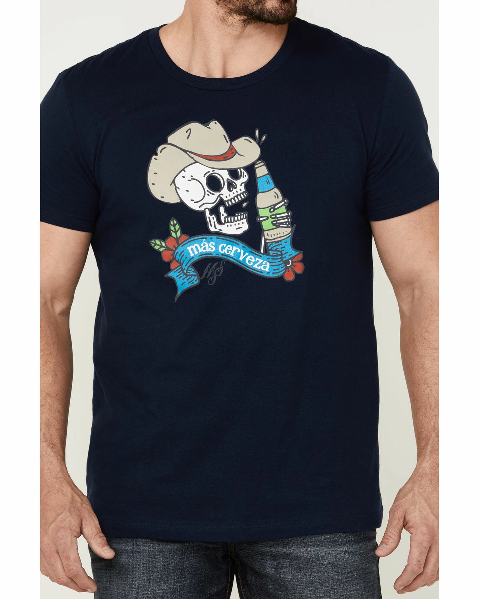 - “Mas Cerveza” w/ drinking cowboy skull & flowers graphic on front